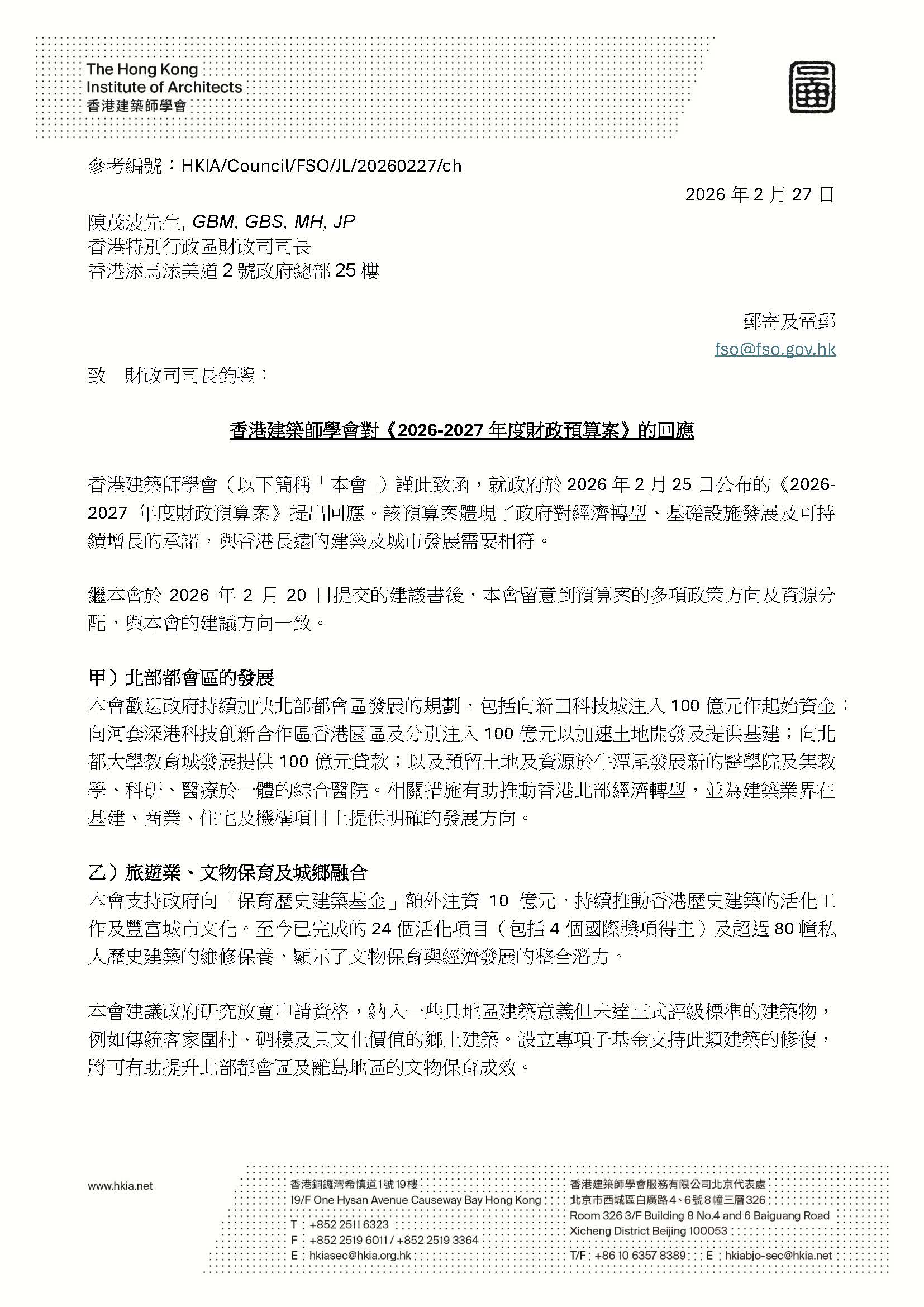 香港建筑师学会就《2026至27年度财政预算案》的回应