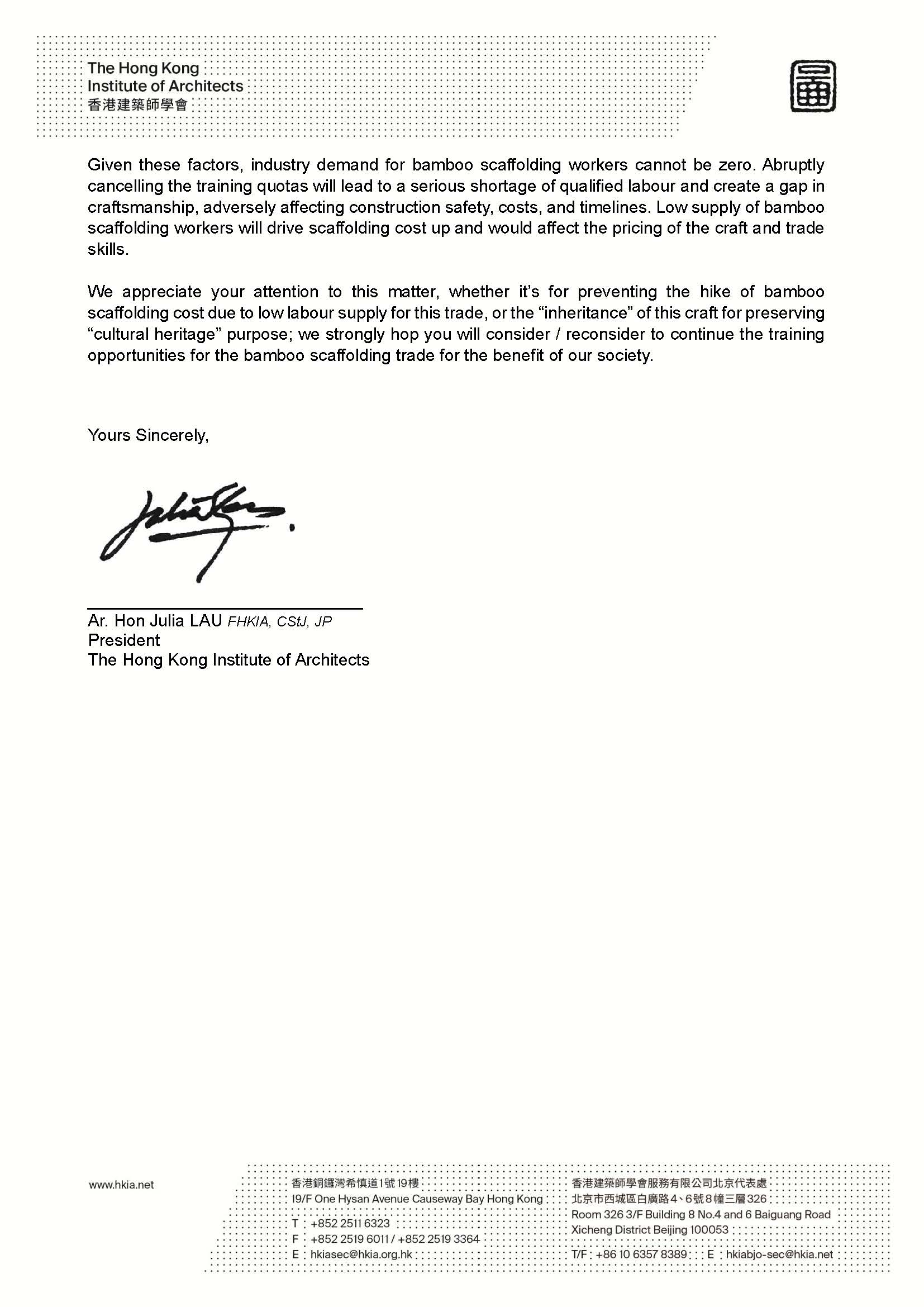 HKIA's Concerns Regarding the Suspension of Bamboo Scaffolding Training Course (and Construction Industry Training Board’s response letter)