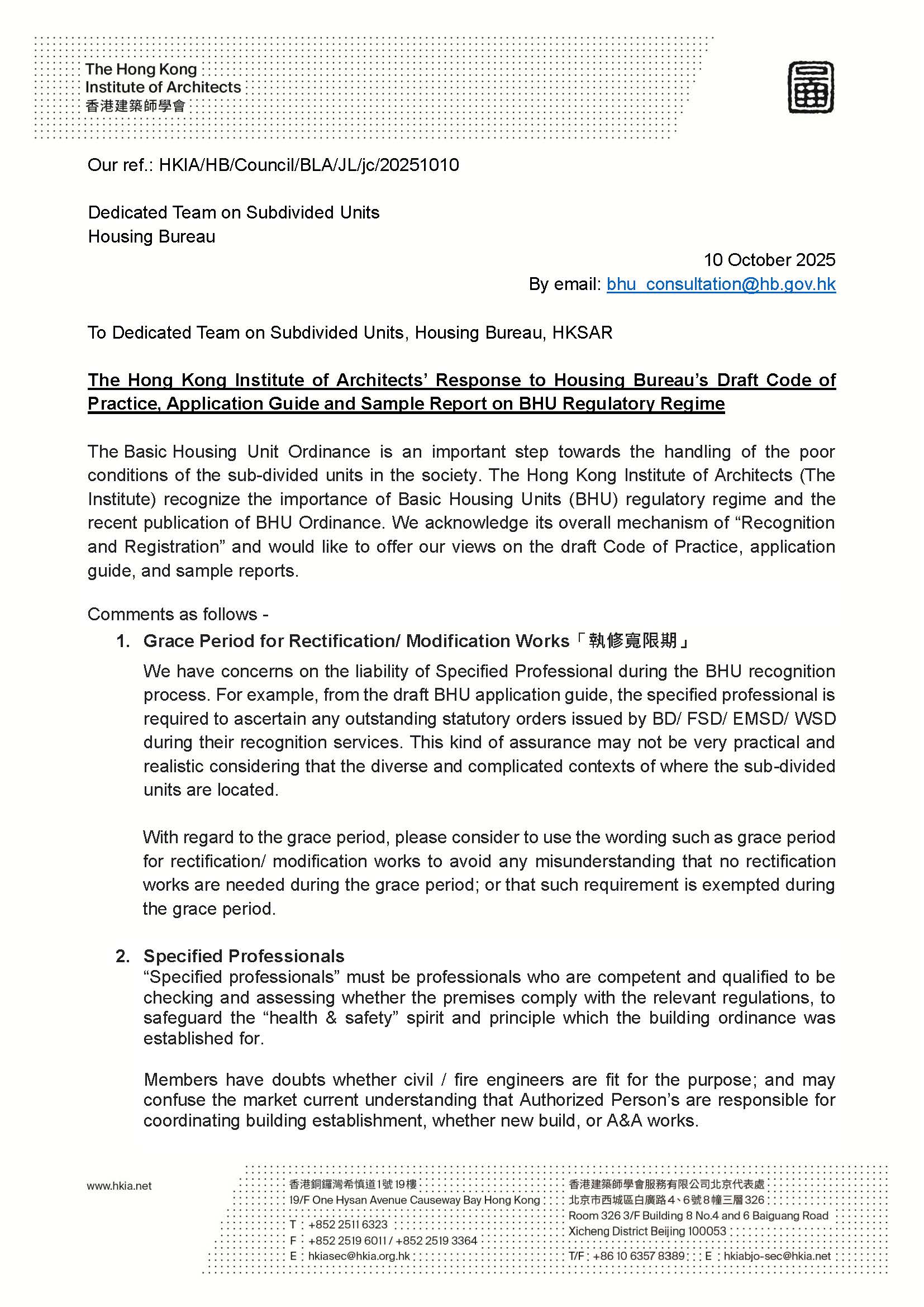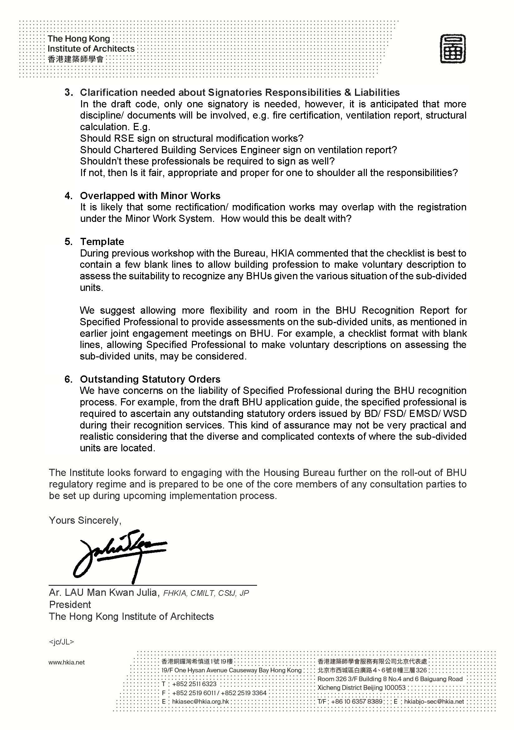 HKIA's Response to BHU draft CoP and Guideline