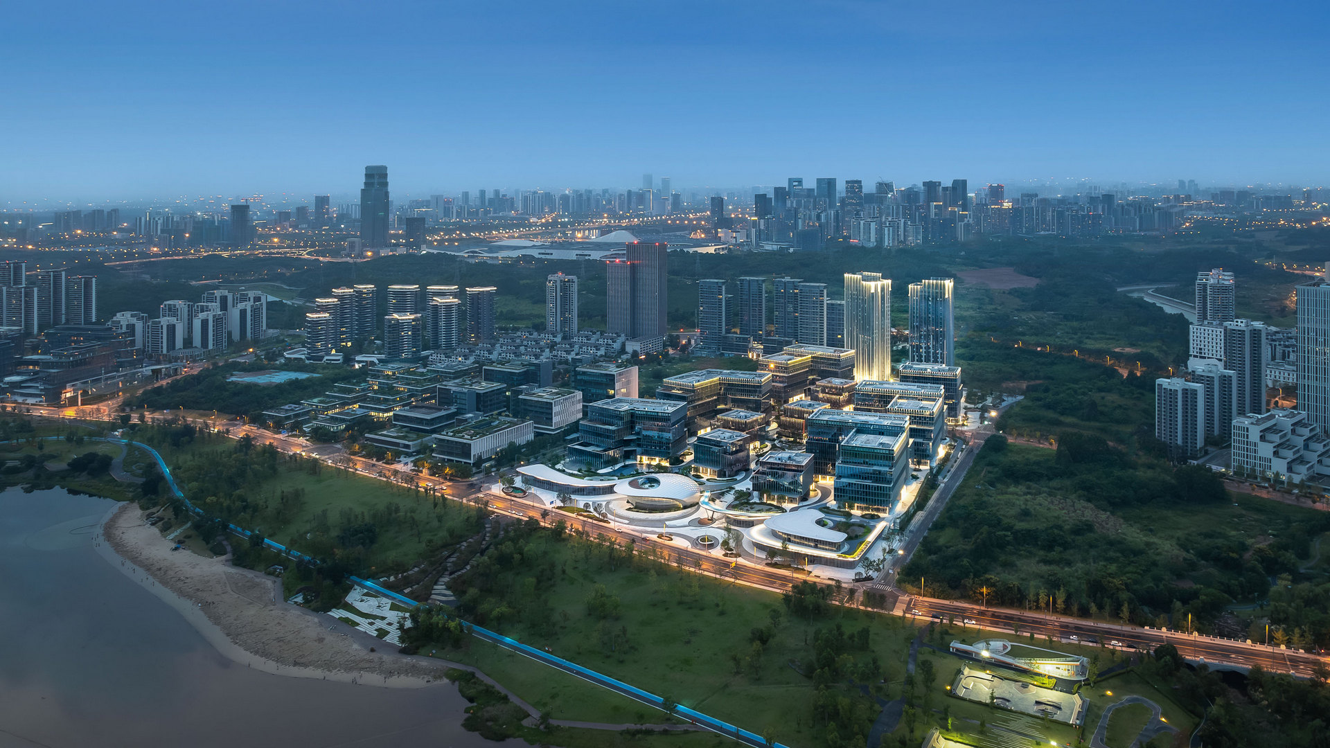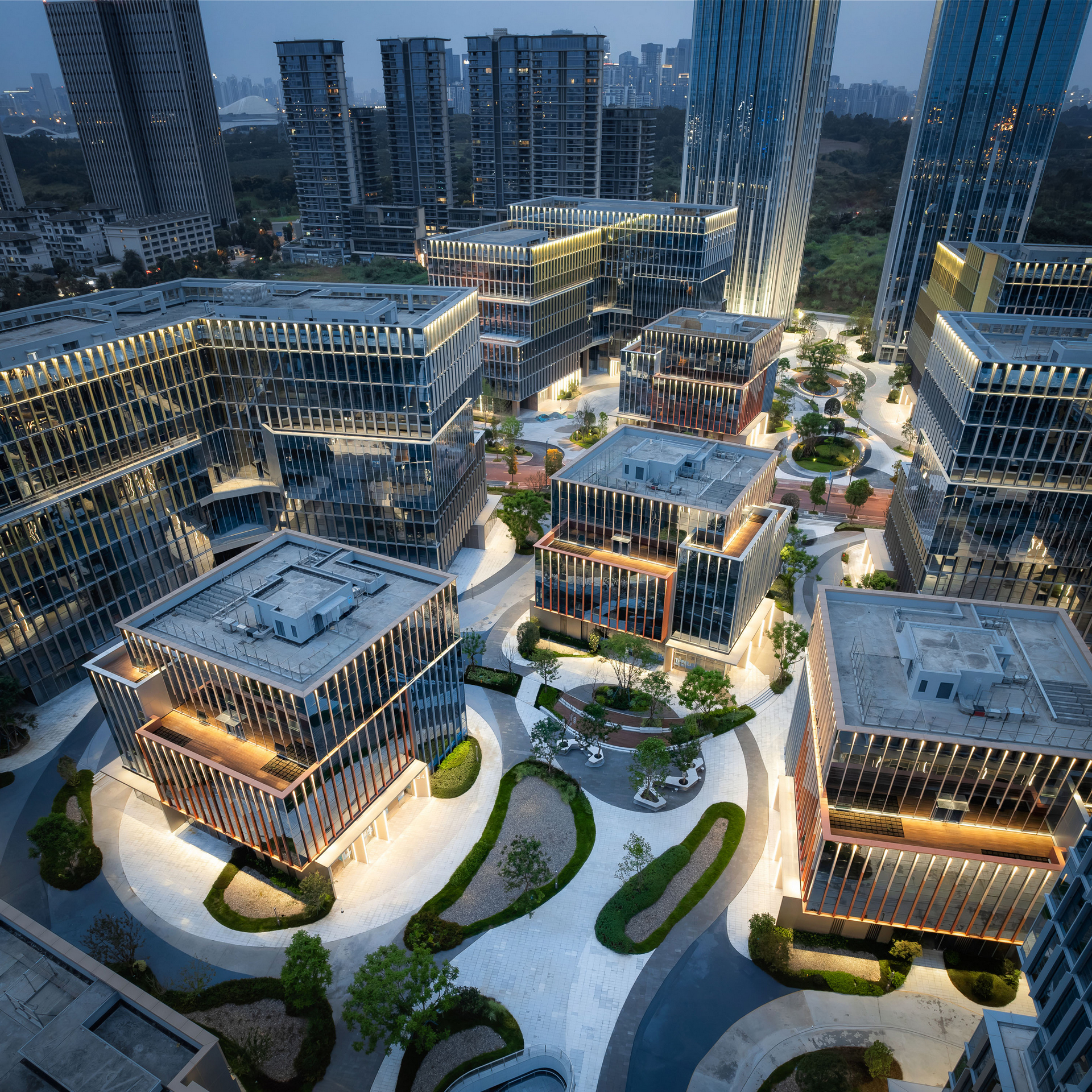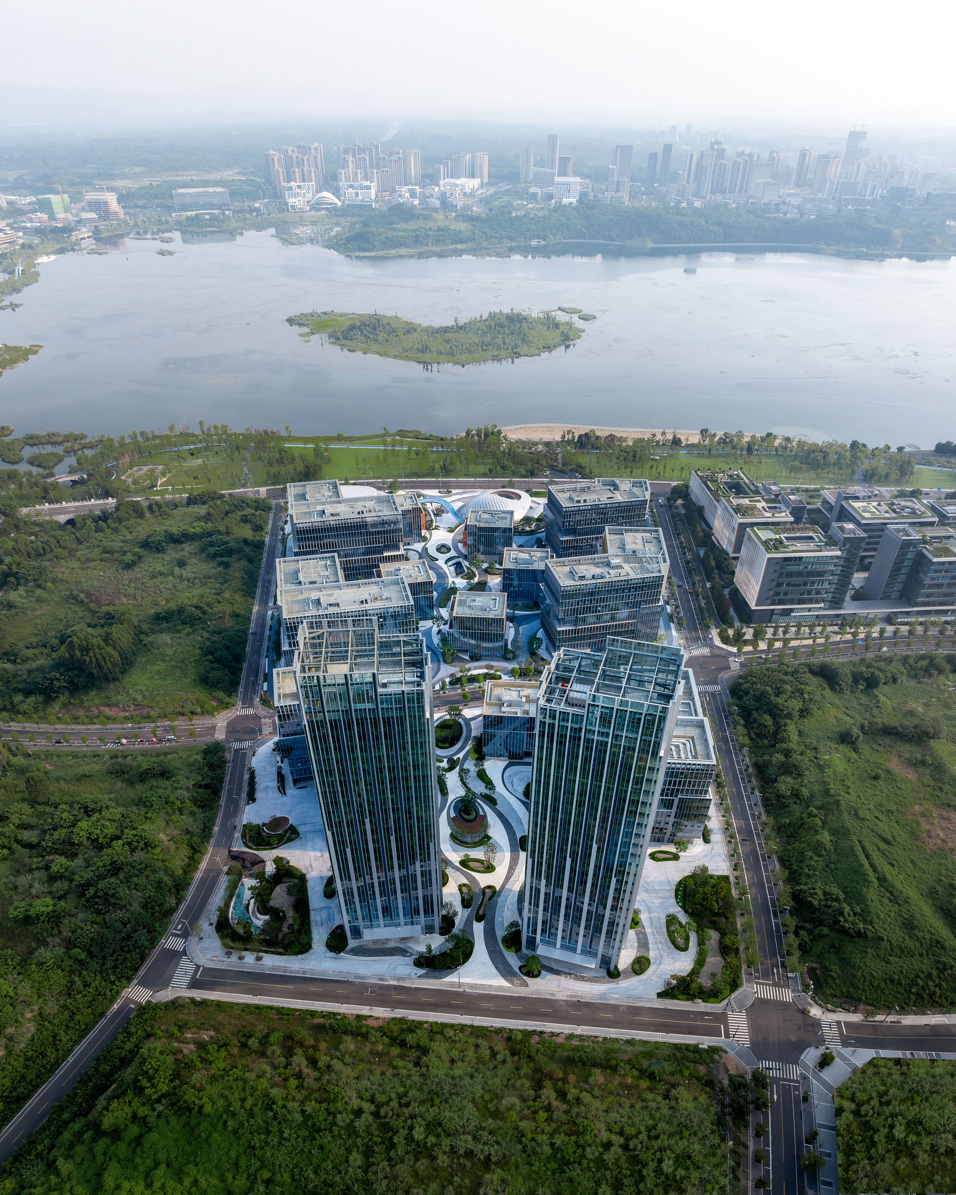 設計充分結合生態,巧妙地通過兩側高中間低的建築佈局,形成疏密有致的園區空間,同時將興隆湖景觀引入其中,結合多層次綠化退台,最大限度提升全域視野,營造高品質科創空間。高挑的辦公塔樓置於地塊北側;綠地景觀蜿蜒貫穿地塊南北,而多層辦公組團圍繞景觀錯落佈局,多元的業態功能彼此獨立,又相互連接。