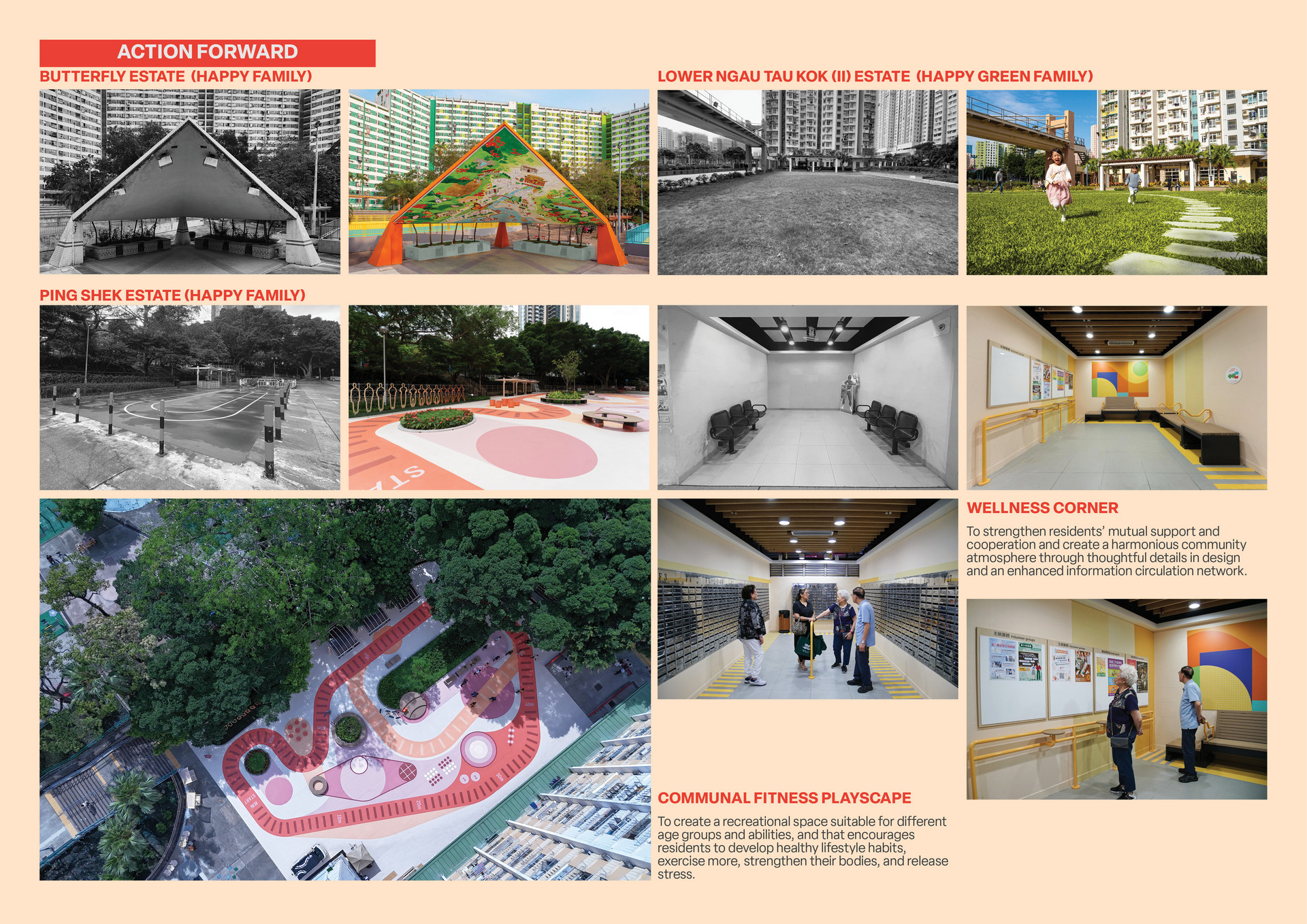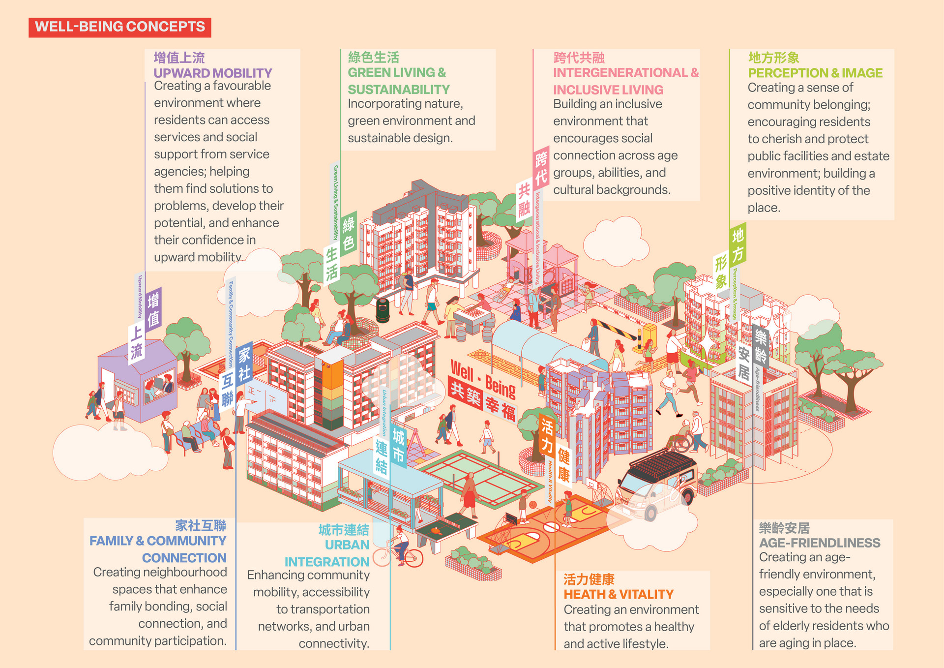 「共築·幸福」項目由香港特別行政區政府房屋局與房委會帶領,集結建築、園境、規劃、學界、醫護等多元專才。運用設計思維和參與式設計原則,納入公屋居民意見,開發提升居住環境幸福感的幸福設計指引。指引重新思考屋邨環境、公共空間和設施的設計應用,促進社區連結並加強屋邨與鄰里融合,營造讓居民感受舒適幸福的環境。
