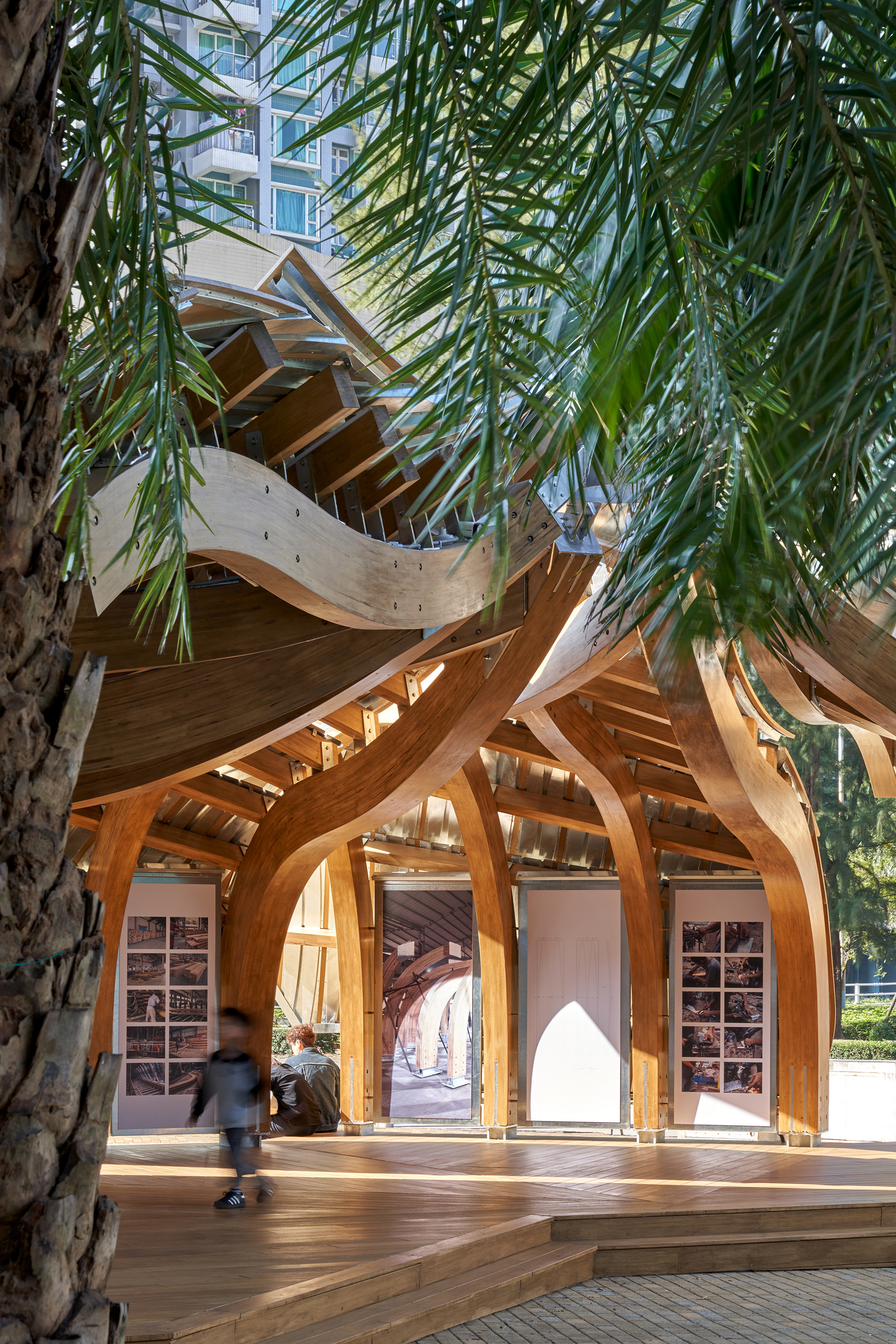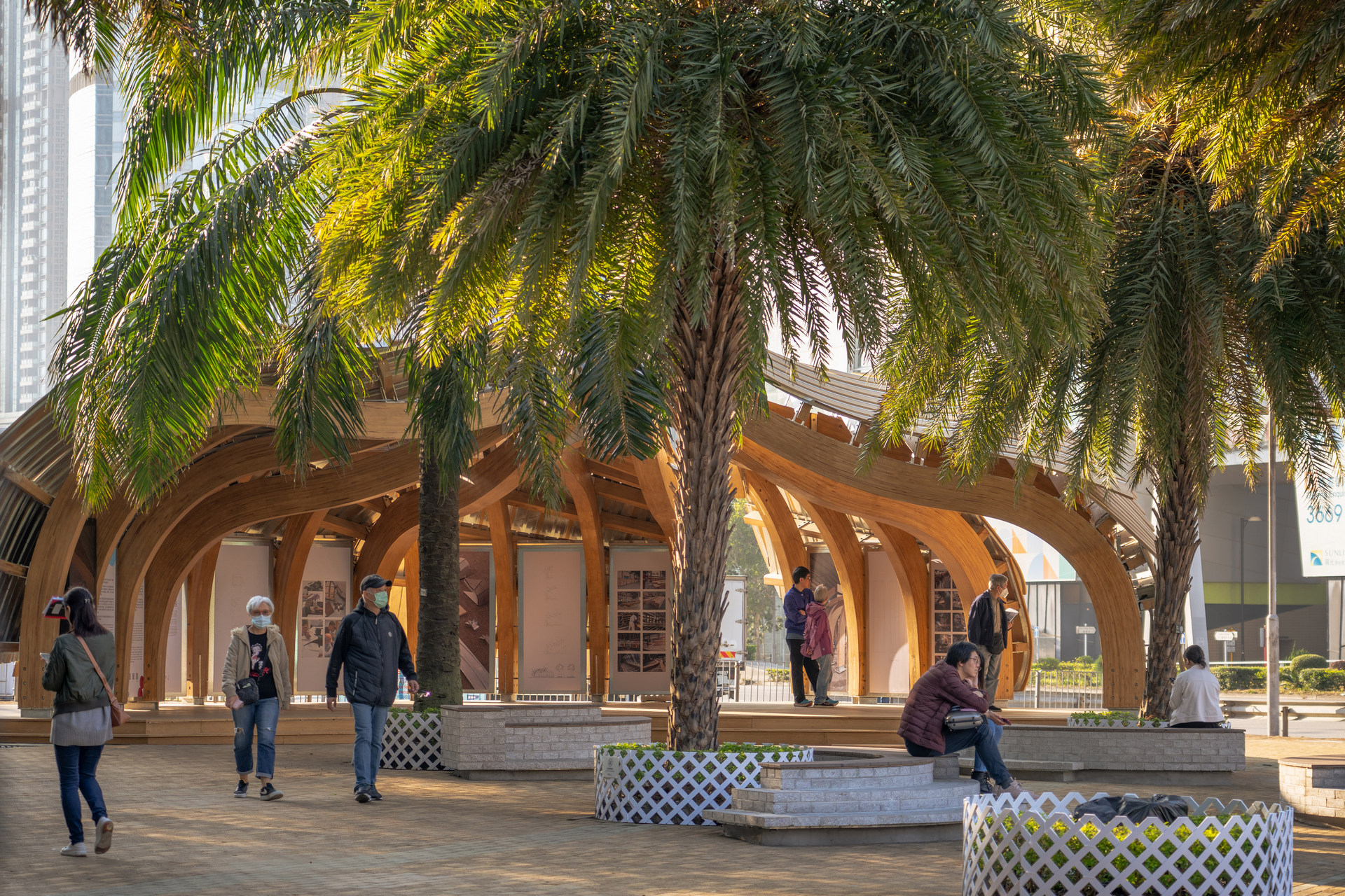 「城市生活所」是爲香港大角咀社區打造的公共空間設計實驗。整個建築有如一柄巨型陽傘,殼體幾何形態圍繞現有樹木構建,延伸遮蔭範圍,阻隔陽光同時保持通風。通過與本地白鐵工匠合作,設計將傳統白鐵工藝與複合竹材料結合。旋轉的建築造型呼應 「轉 - 角」 主題,創造起伏海浪的意象,重現大角咀海陸變遷的空間特色。