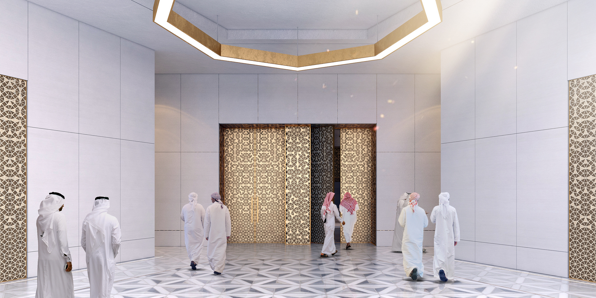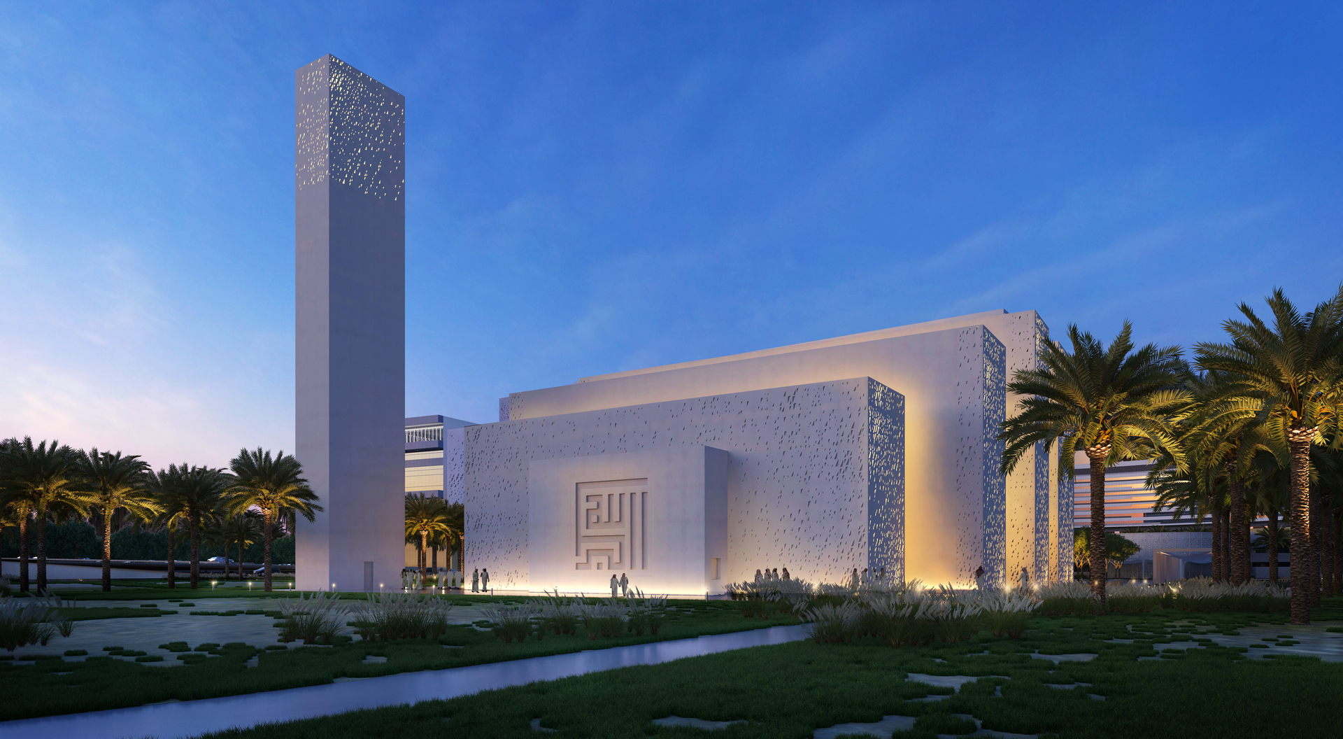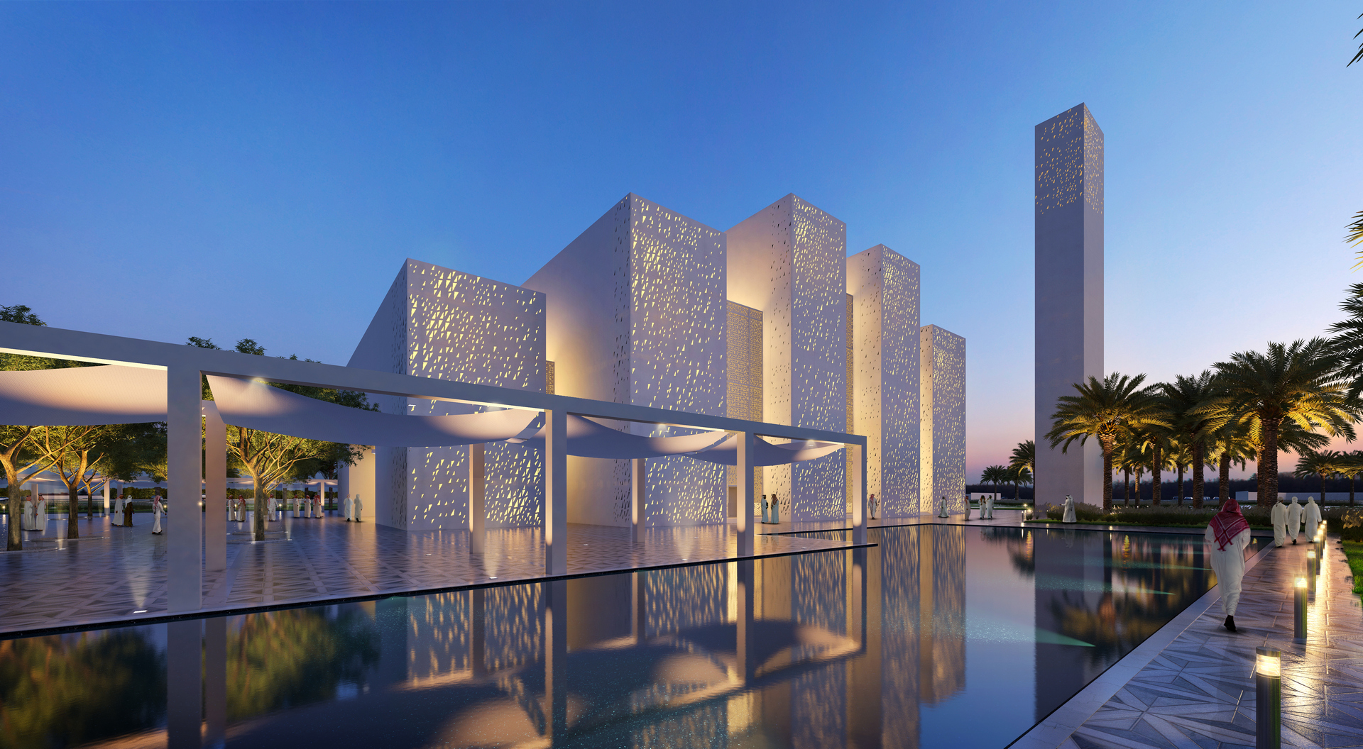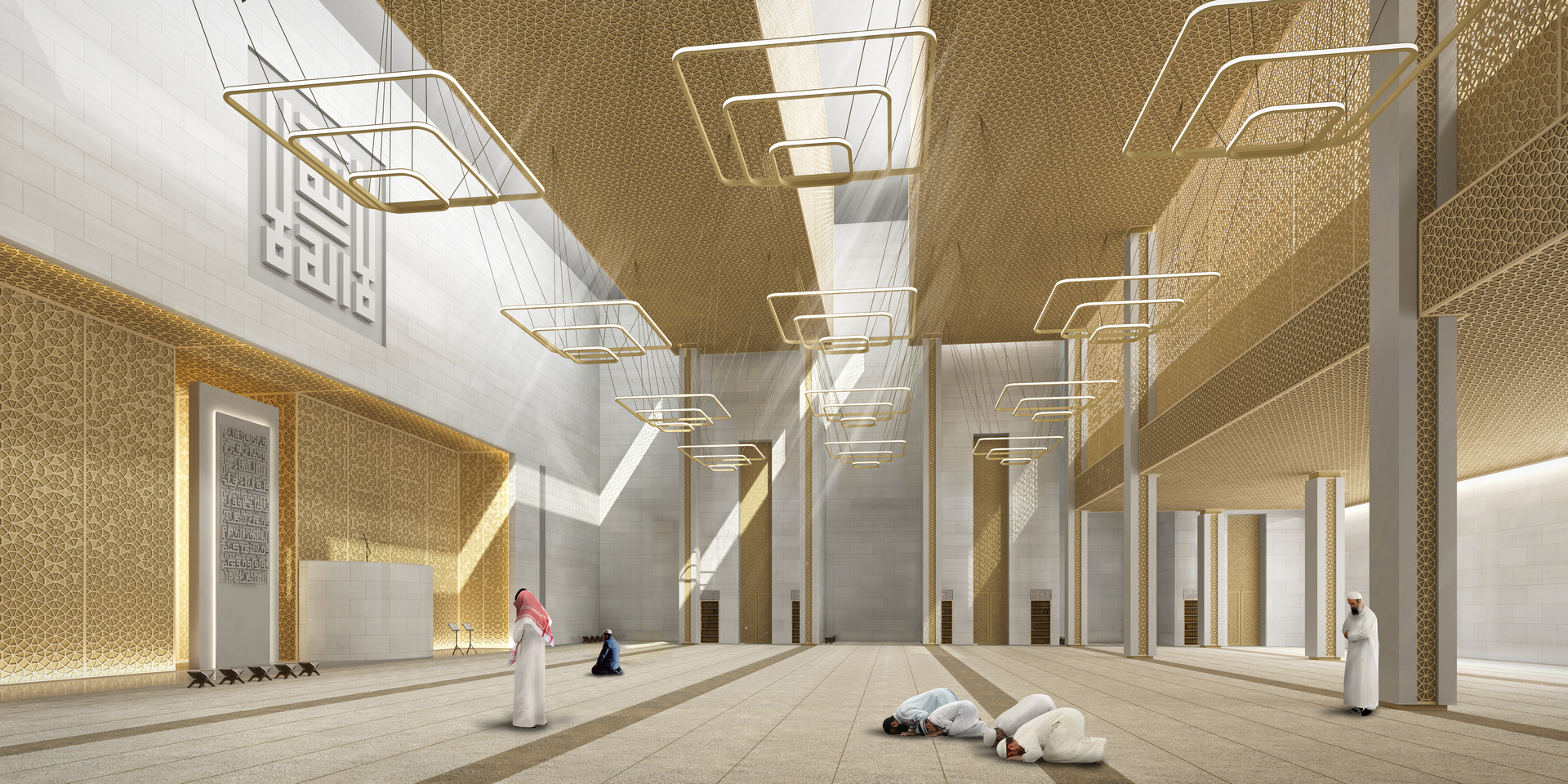 利雅德安全部隊醫療中心的清真寺由內政部委託建造,為全球最大醫療園區之一。容納逾1500名信徒,設男女獨立祈禱區、沐浴區、伊瑪目辦公室、圖書館及學習區。靈感源自堆疊的《古蘭經》,透過層疊直線呈現採光。外牆以納吉迪風格融合傳統圖案與當代設計。清真寺坐落園區核心,提升可及性、視覺性與精神象徵,豐富醫院文化氛圍。