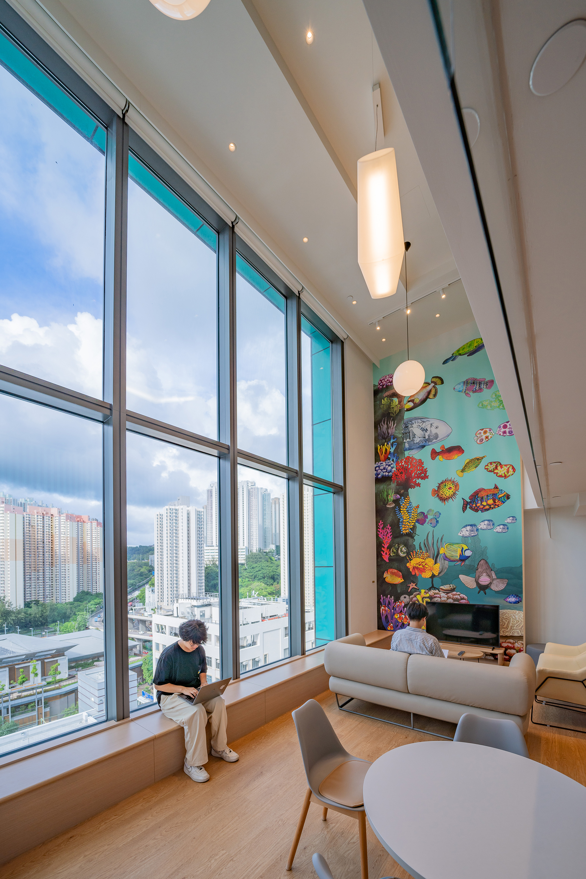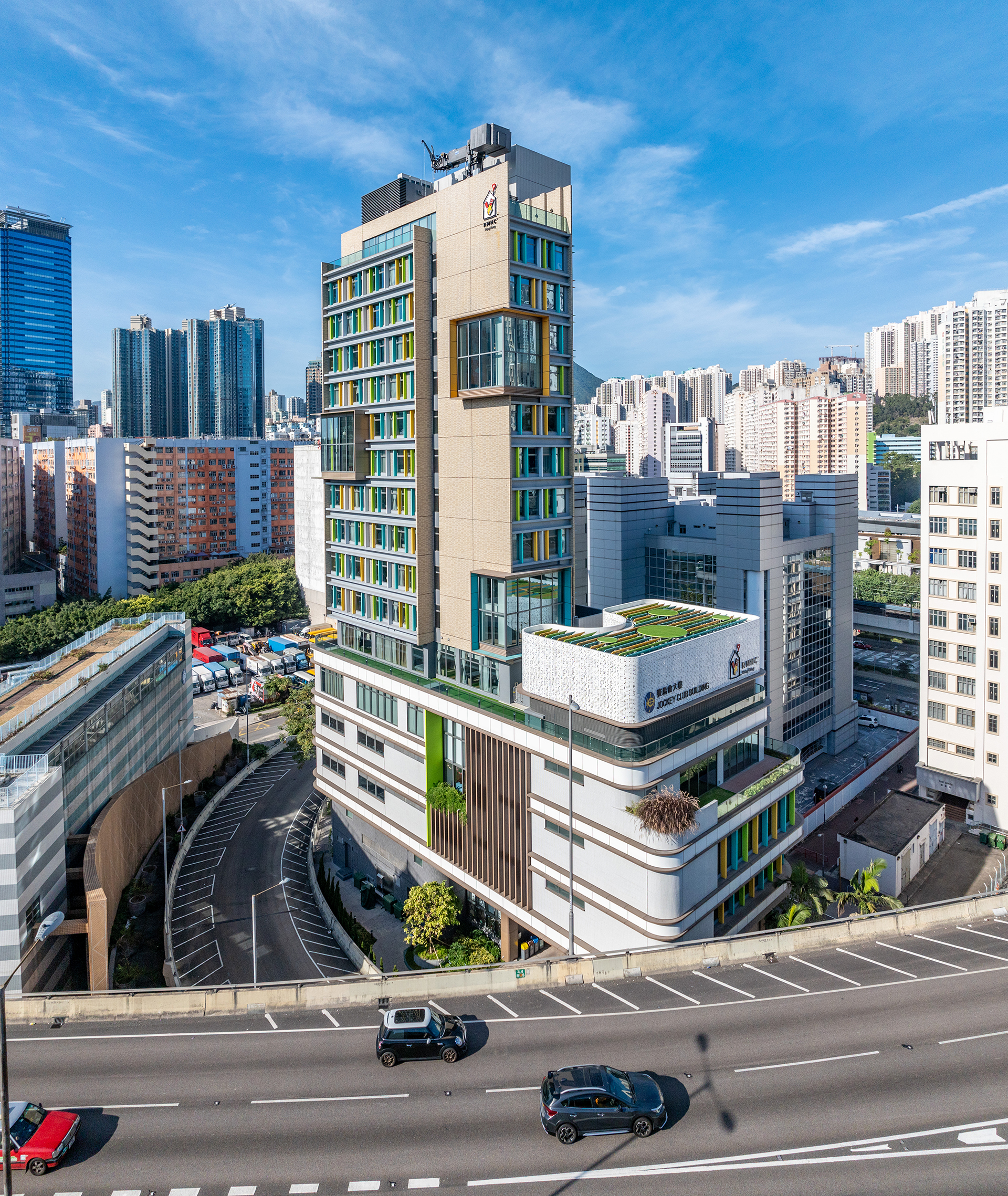 新家舍旨在為康復兒童及其家庭提供一個安全可靠的環境。我們的設計理念是「快樂」和「關懷」。塔樓上的「禮盒」成為空中的客廳,促進住戶聯繫。裙樓的雙層高空間讓住戶的日常空間陽光充沛,同時將空間分為作東西兩翼作不同用途。家舍的環境增強家庭之間相互支持,促進了小社區內的凝聚力,鼓勵大家一同應對疾病的重壓。