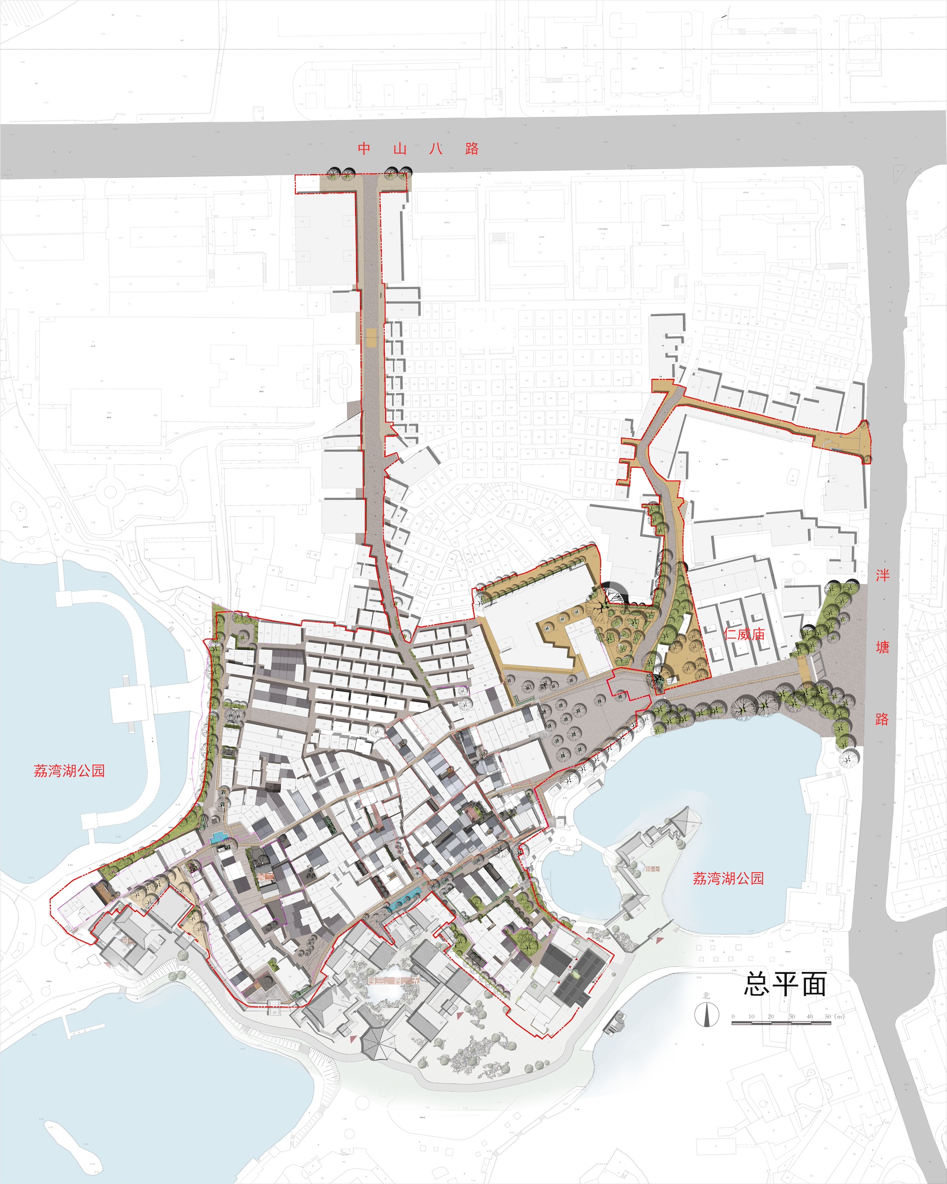 泮塘五約微改造位於廣州市荔灣區泮塘路。用地面積為44308.00㎡,總建築面積53064㎡,其中可改造建築面積為13872.75㎡。 改造依舊保留了泮塘“魚骨”式村落肌理。通過“共同締造”,發掘並恢復非遺文化活動及傳統民俗活動所,推動歷史街區民俗文化,引入特色傳統手工藝和年輕時尚新業態,打造文化傳承和旅游體驗融為一體的特色的歷史街區。