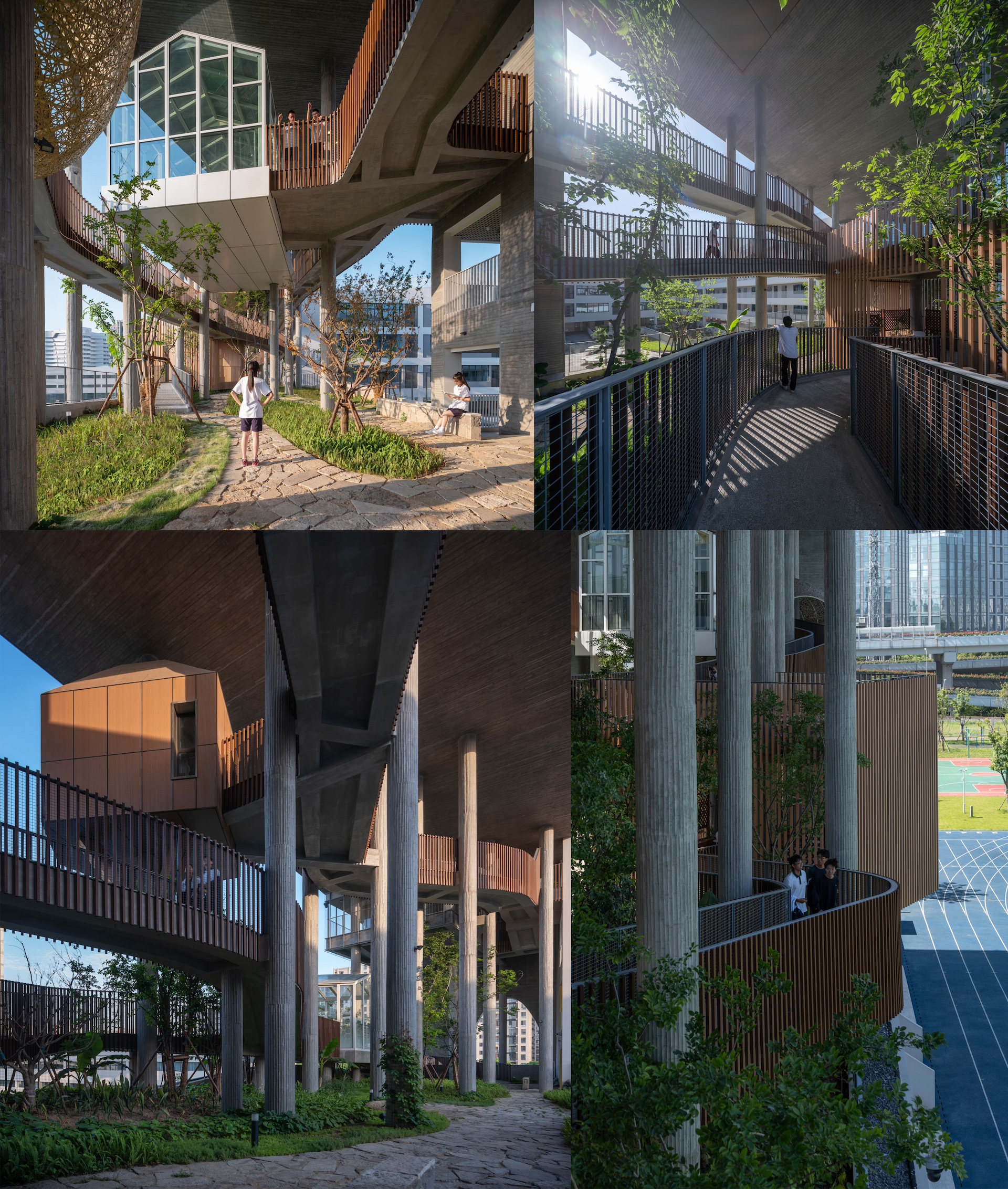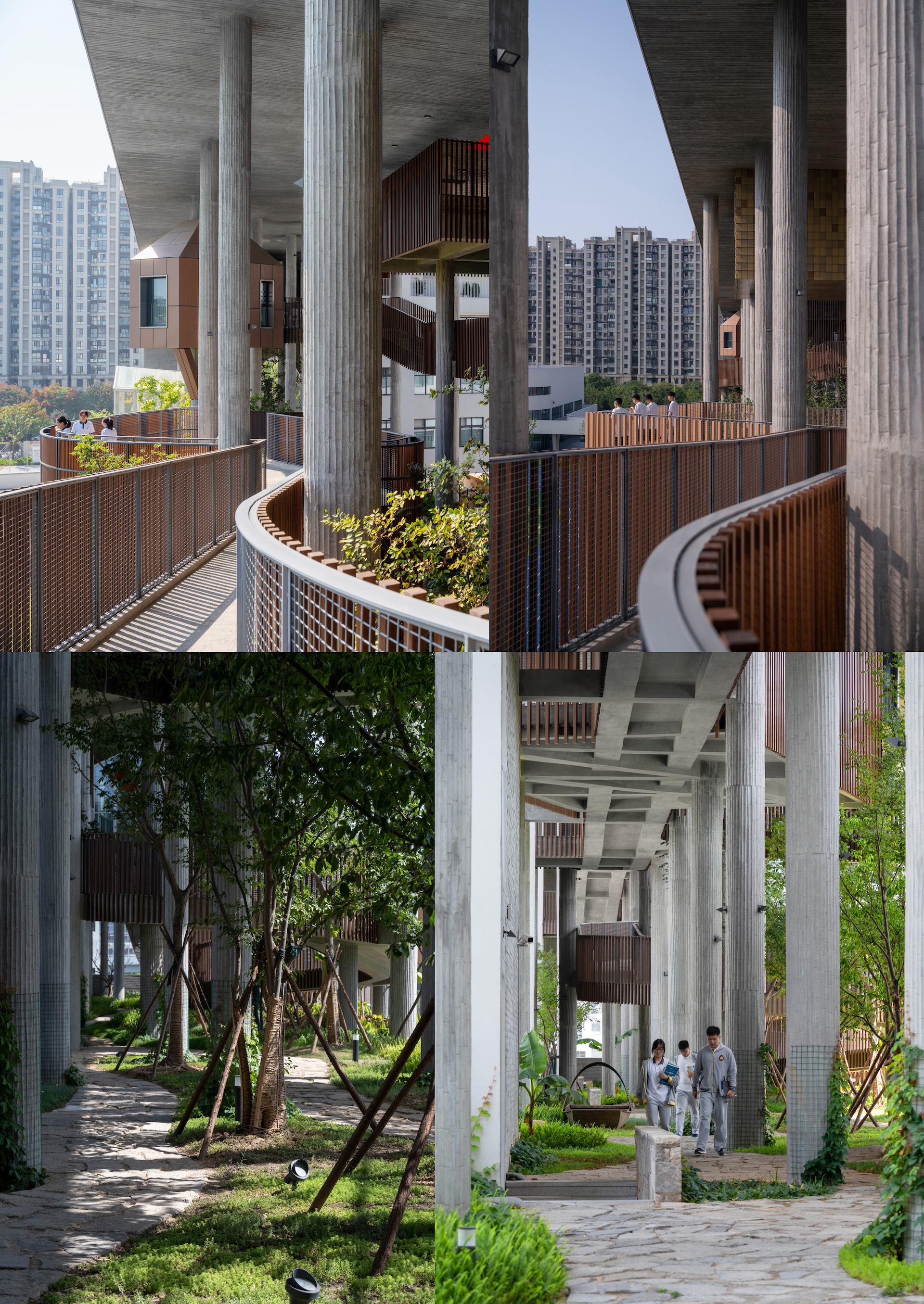 “效率優先”的教學模式下的反思,我們希望設計一個可以“浪費時間”的校園。在“空間總效率”不變的情況下,把“校”與“園”拆開,將“效率”進行重新分配,讓其中負責教學的“校”盡可能呈現出最高效緊湊的狀態。同時,在整個教學樓面向太陽升起的方向騰出了一片巨大的“無用空間”,將這片空間設計成了一片充滿綠植和陽光的空中森林。