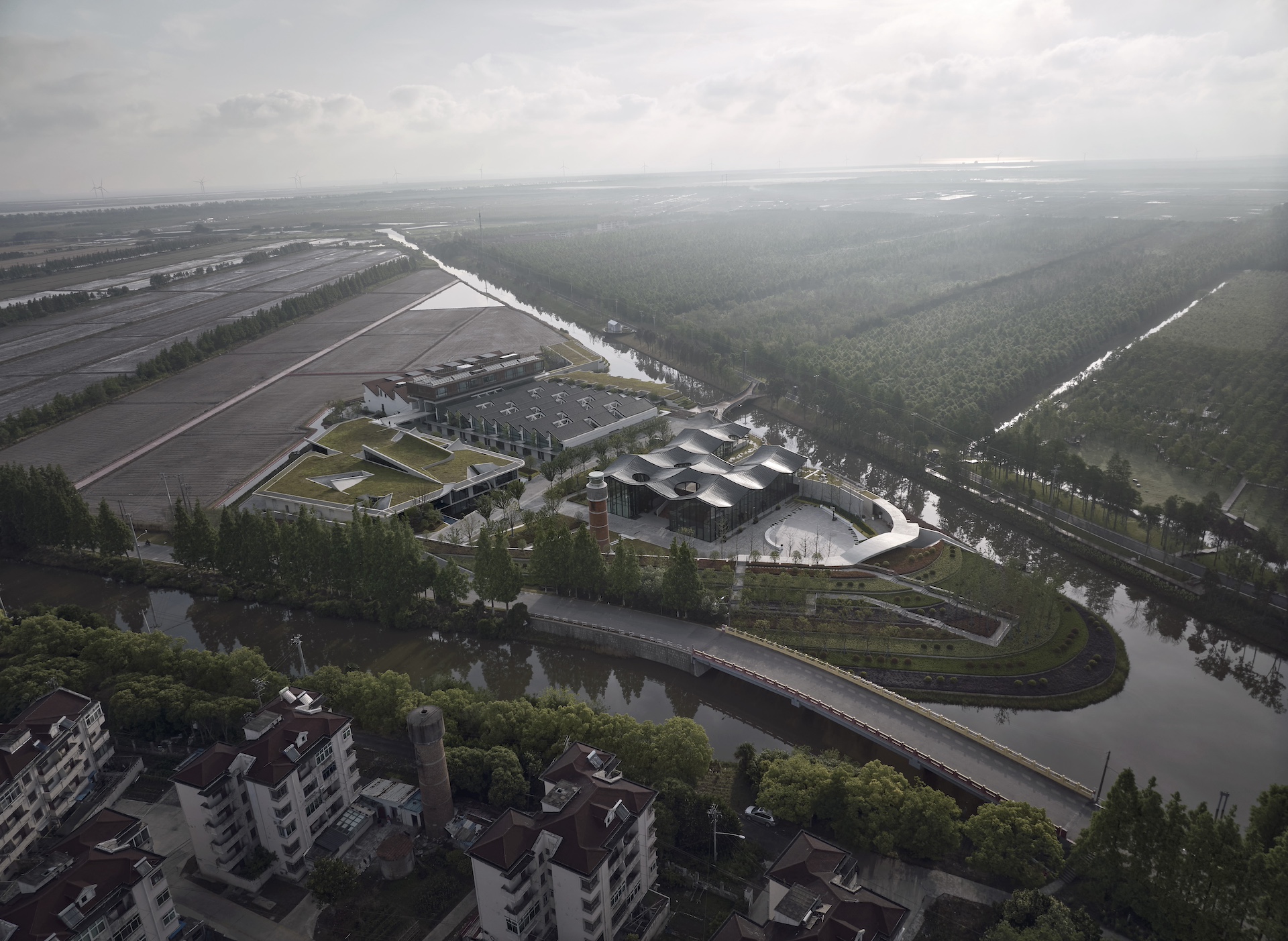 項目位於上海市崇明區東平鎮前哨農場,兩條河道交彙於此造就了特色的三角洲頭地形;北側的農田與場地內原有的工業廠房傳達了知青時代集體生活的記憶。 結合區域發展訴求,項目在滿足地塊防汛要求的基礎上,將堤與生態景觀、公共空間、建築進行復合化設計,整體更新為具有酒店客房、展示中心、會議中心等多元功能的度假園區。