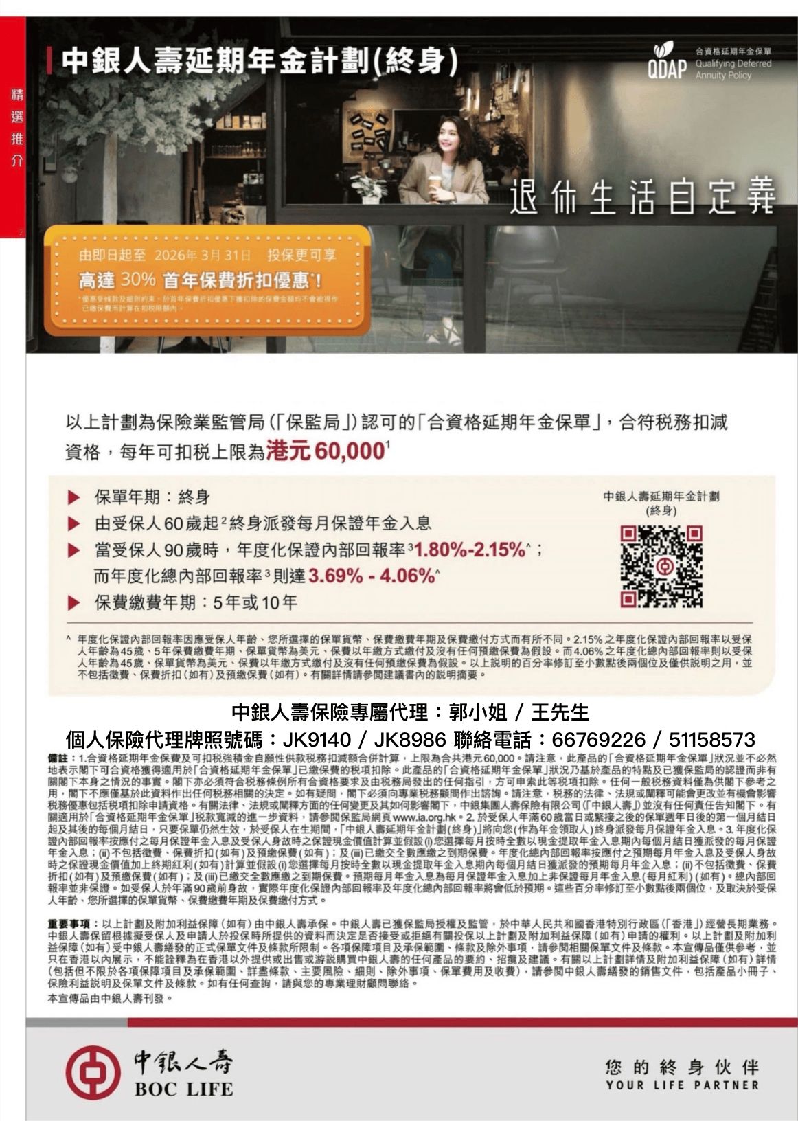 中銀人壽延期年金計畫(終身)是由香港保監局認證的「合資格延期年金」(QDAP),其所繳付的保費可在薪俸稅或個人入息課稅中申請稅務扣除。納稅人每年合資格保費及強積金自願性供款扣稅上限為合共 60,000港元,以最高稅率17%計算,每年最多可節省 $10,200港元稅款,助您有效規劃稅務,提升財富積累效率。