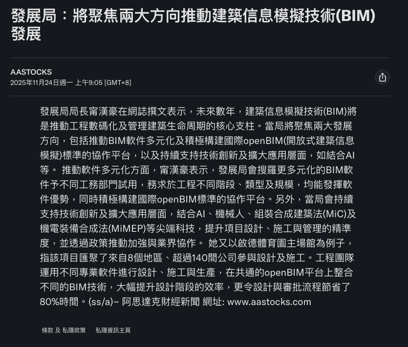 發展局:將聚焦兩大方向推動建築信息模擬技術(BIM)發展 AASTOCKS 財經