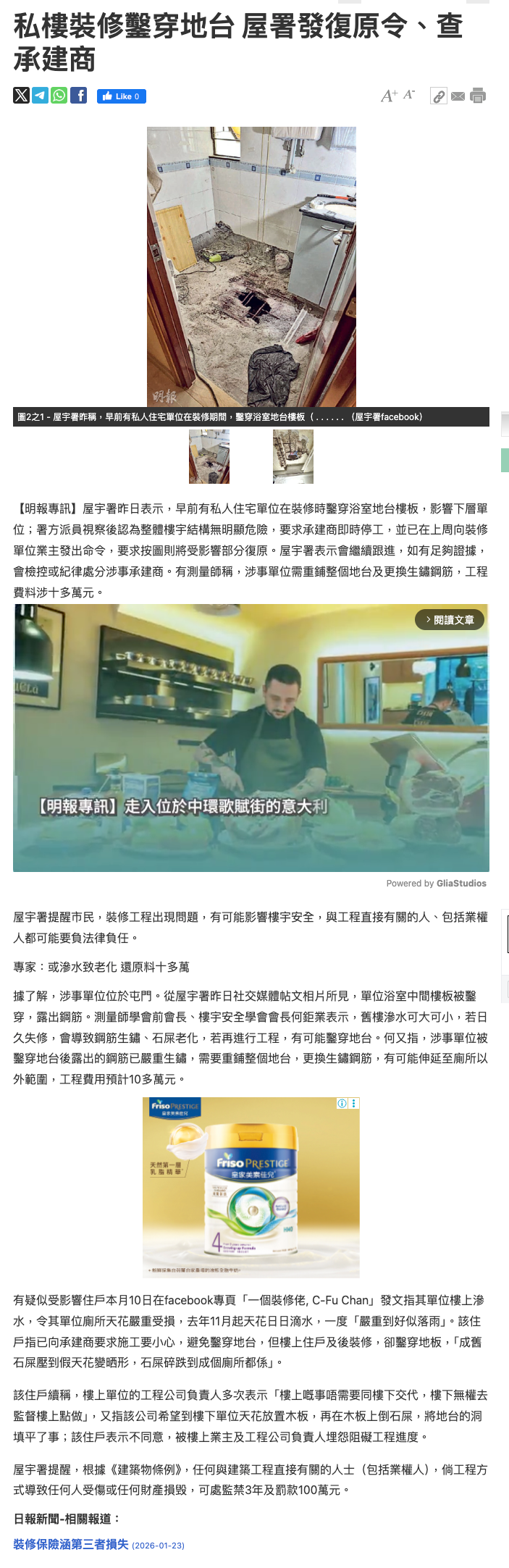 私樓裝修鑿穿地台 屋署發復原令、查承建商