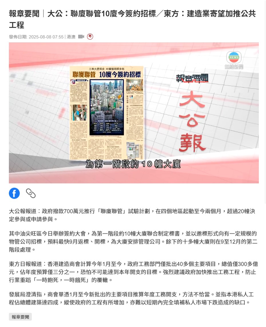 報章要聞|大公:聯廈聯管10廈今簽約招標/東方:建造業寄望加推公共工程