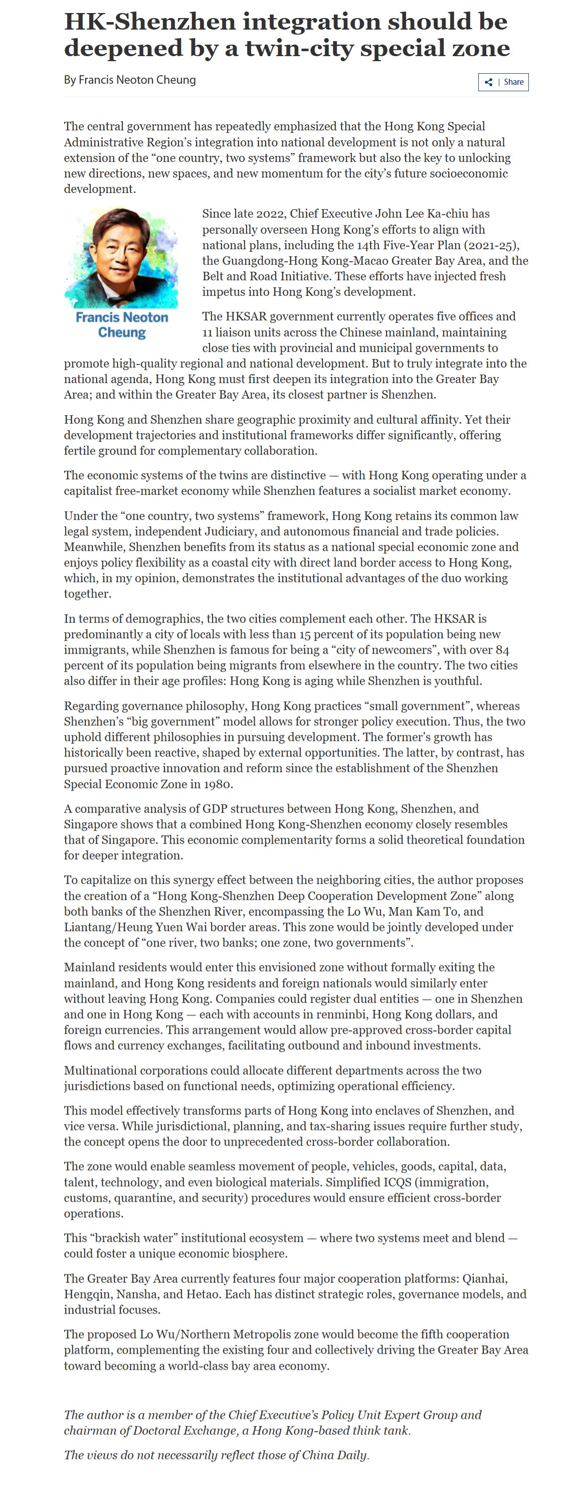 HK-Shenzhen integration should be deepened by a twin-city special zone