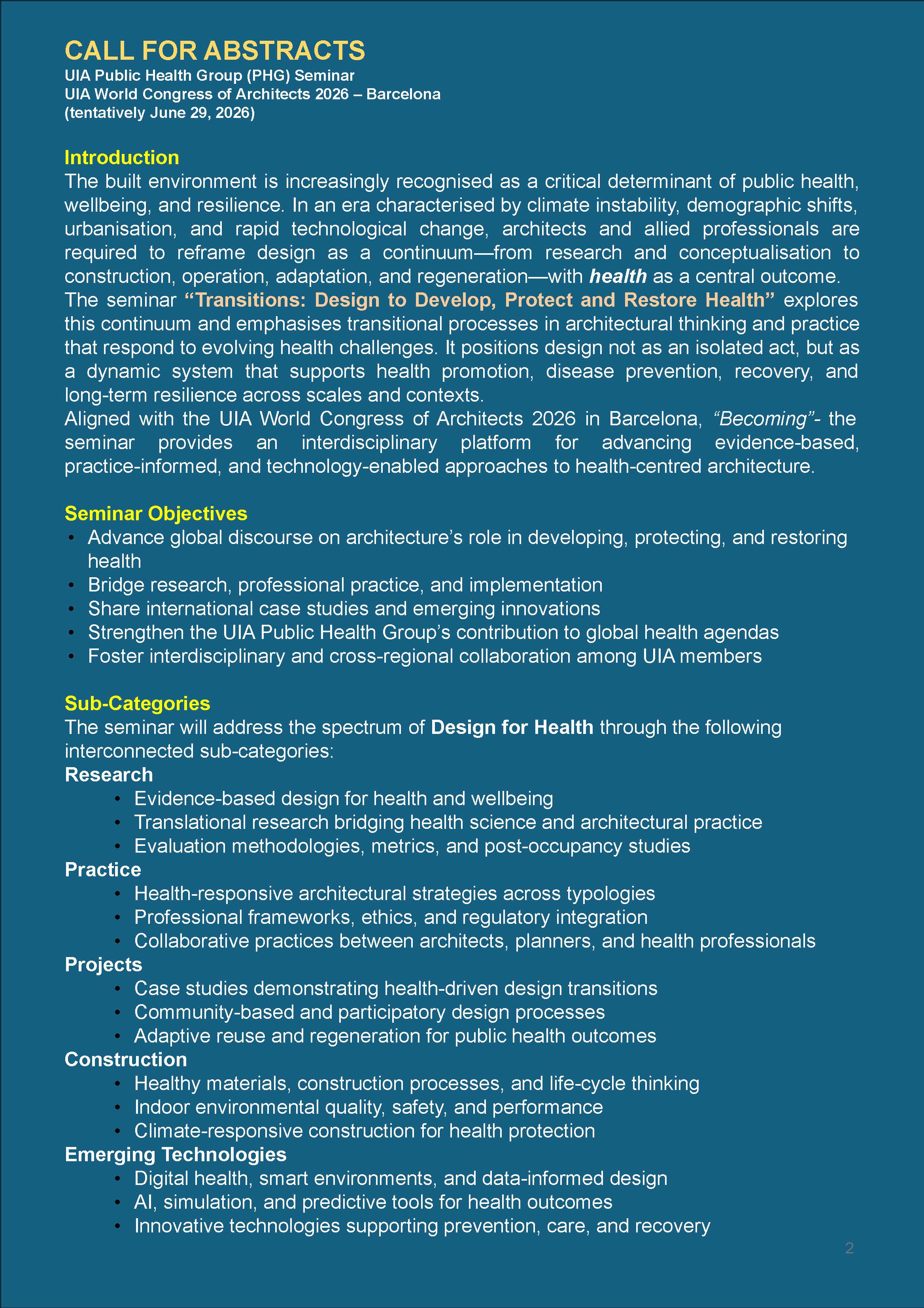 UIA-Public Health Group Work programme SEMINAR 2026, Barcelona, Spain - Transitions: Design to Develop, Protect and Restore Health